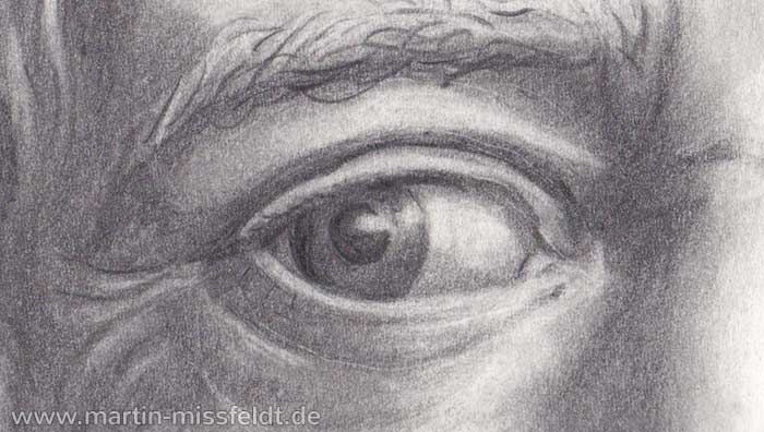 While I was drawing, a camera was running over my head. The time-lapse video (below) clearly shows that I only noticed at the end that basic things were missing. I had kept quite strictly to the original, and after I signed the drawing and hung it on the wall, I realized from a distance of about five meters that the head was "ironed" all around. So I puffed up the hair a bit, added some stubble and especially drew the ears a bit more protruding. And only at the very end I realized that the left edge of the picture must be dark of course.